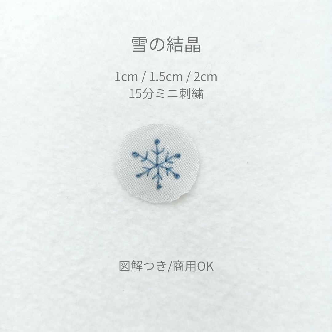 1cm・1.5cm・2cmの3サイズで楽しめる、雪の結晶のミニ刺繍図案です。