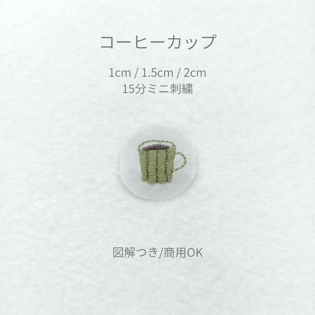 1cm・1.5cm・2cmの3サイズで楽しめる、コーヒーカップのミニ刺繍図案です。